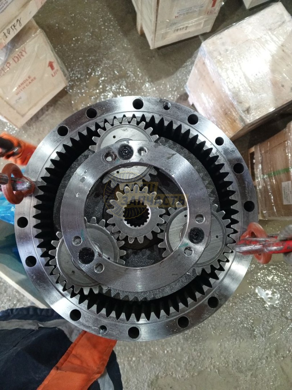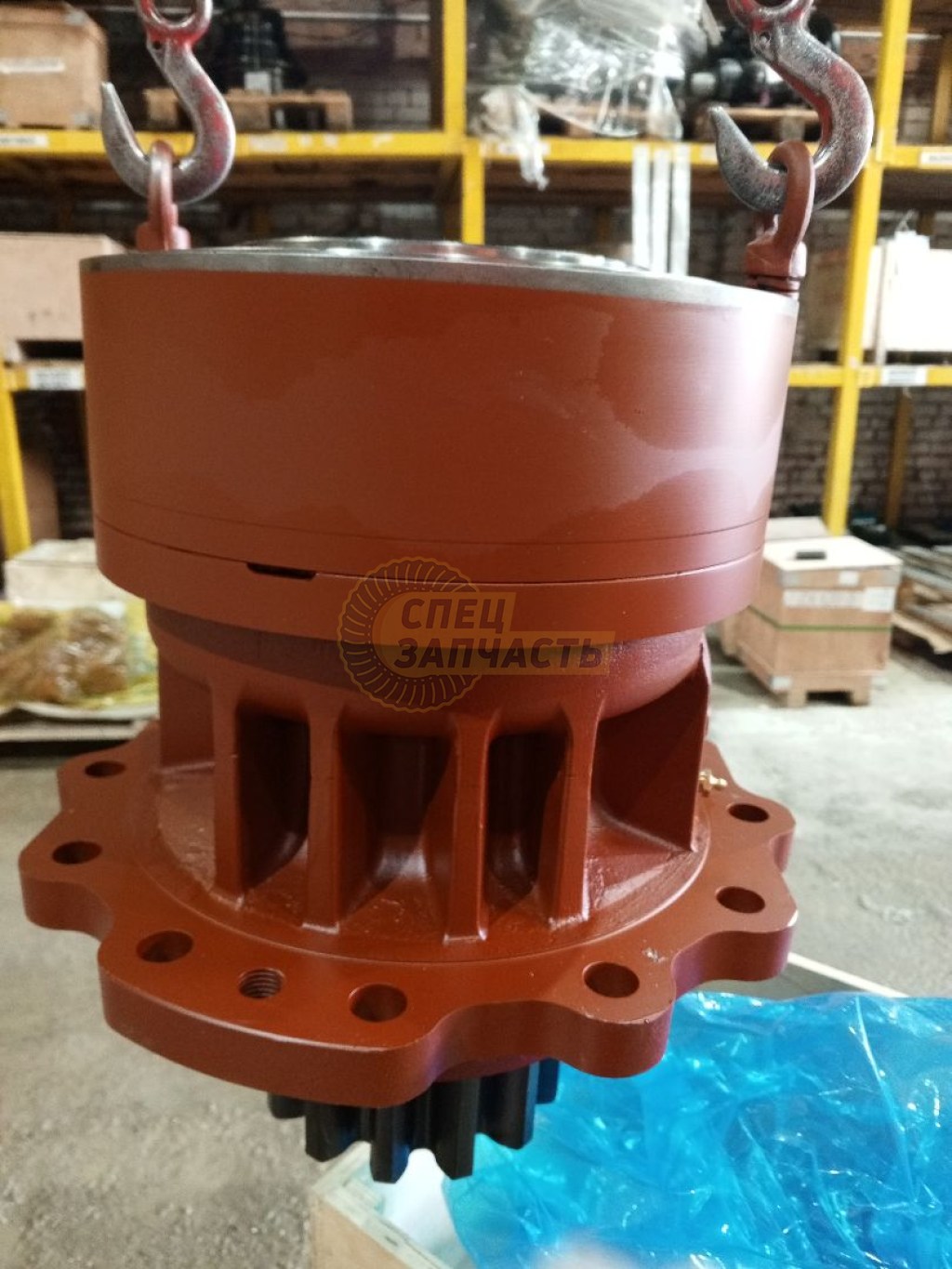 Планетарный редуктор состоит из двух последовательных ступеней. Каждая ступень — солнечная шестерня, набор сателлитов на игольчатых подшипниках, коронная шестерня и водило. Гидромотор Kawasaki M5X130CHB (устанавливается сверху на корпус редуктора) вращает входной вал с высокими оборотами. Через две планетарные ступени обороты понижаются до ~10,9 об/мин, а крутящий момент многократно возрастает. Пиньон на выходном валу вращает зубчатый венец опорно-поворотного устройства, приводя платформу массой свыше 15 тонн во вращение.