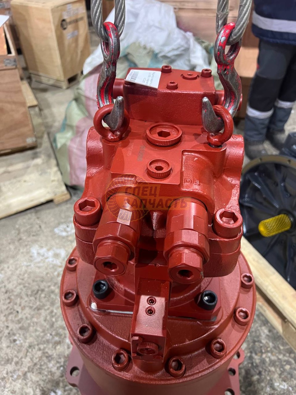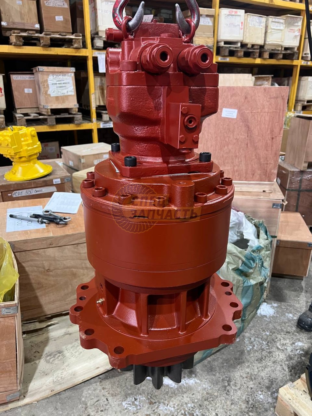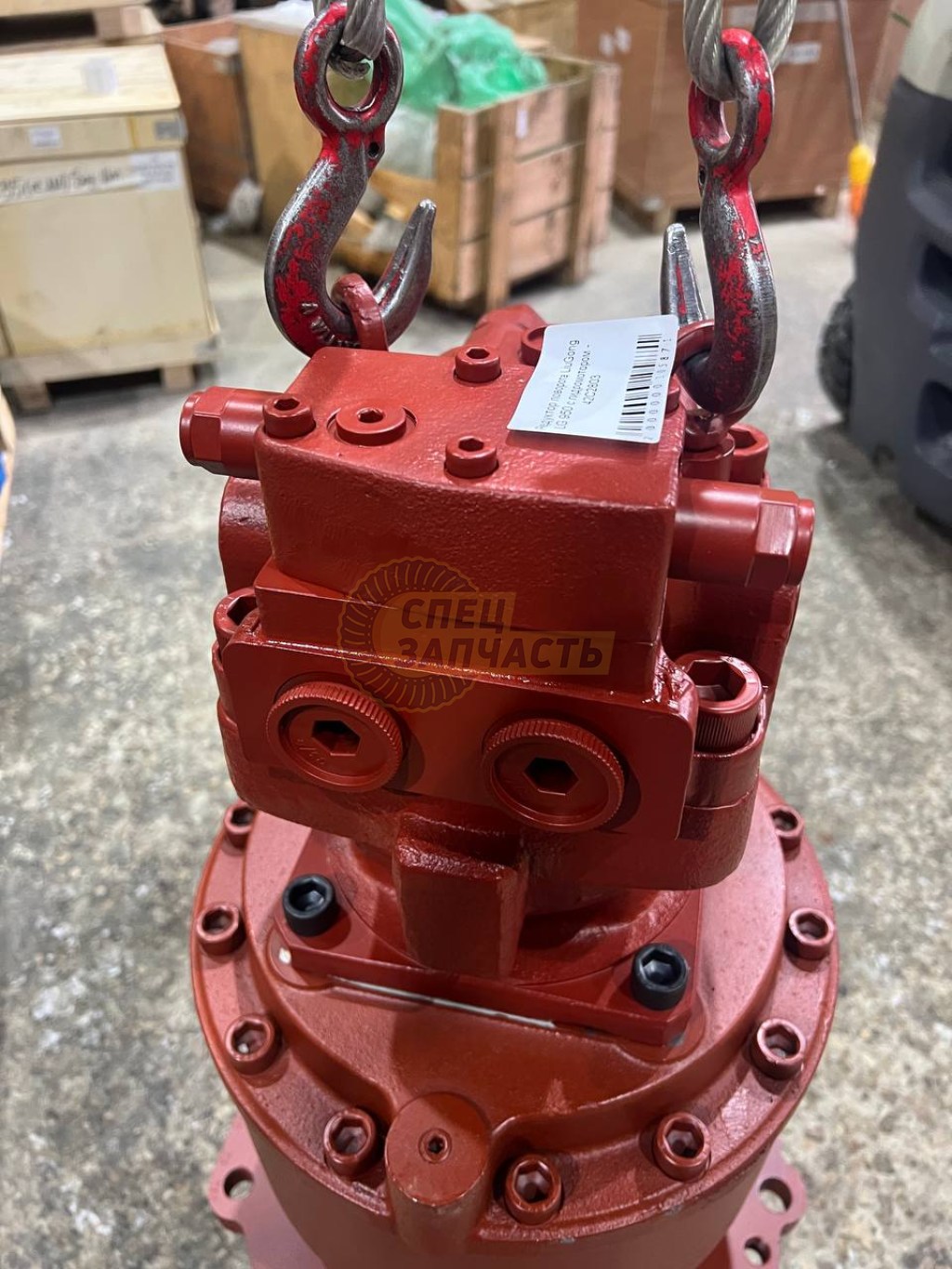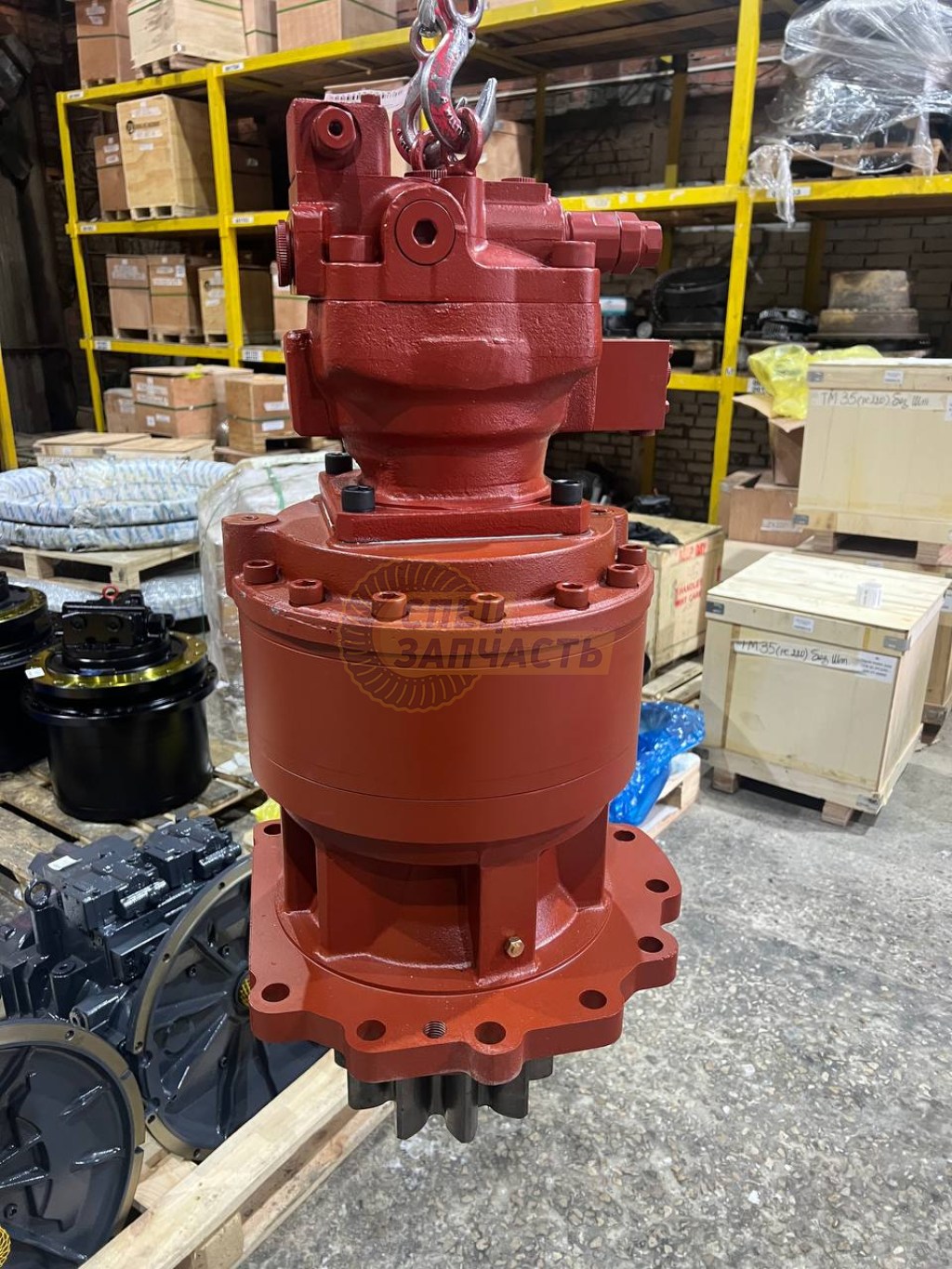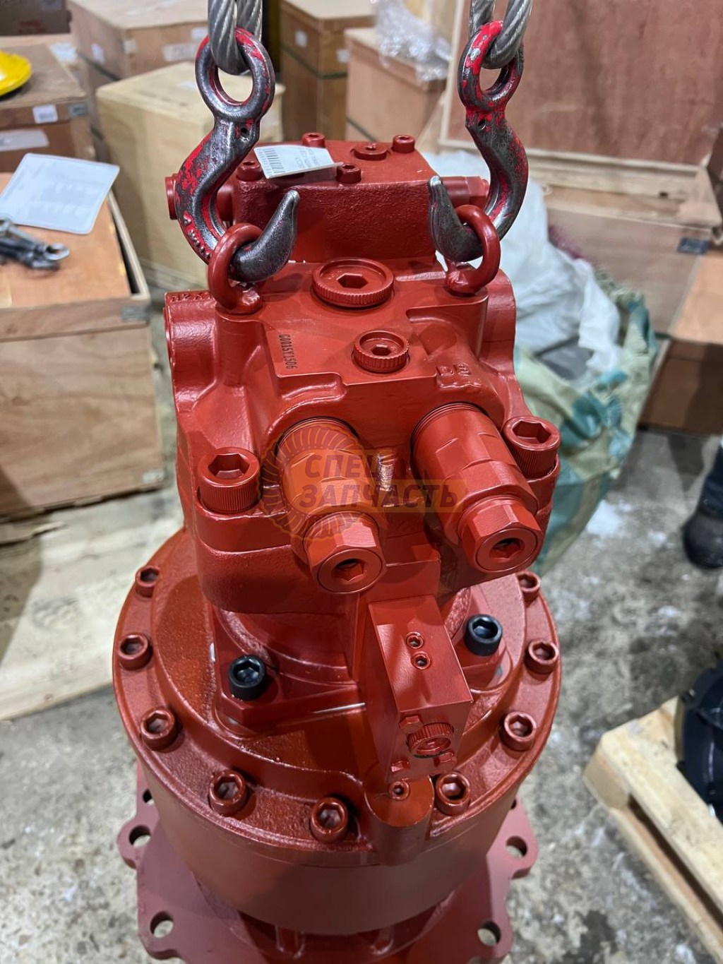 Гидромотор поворота получает масло от основного насоса (Kawasaki K5V212DPH) и вращает входной вал планетарного редуктора с высокими оборотами (порядка 1 500–2 500 об/мин).